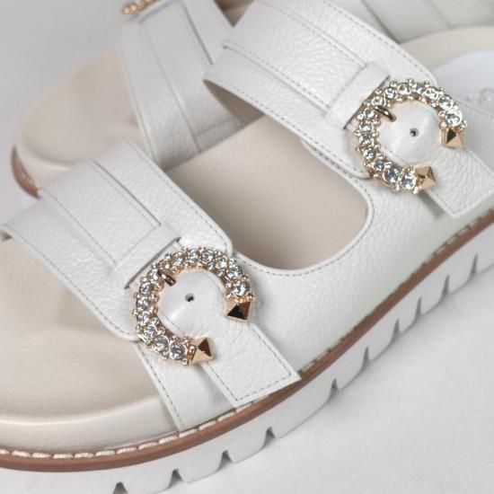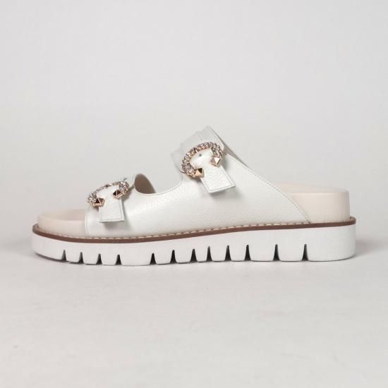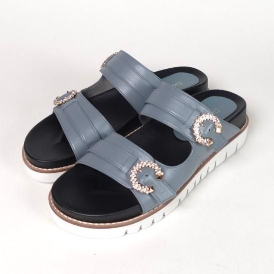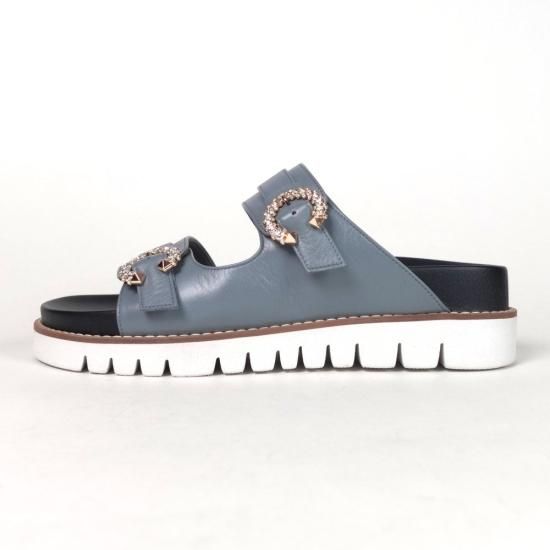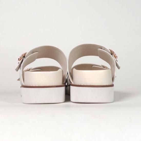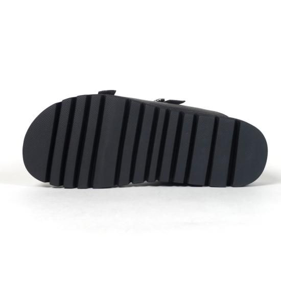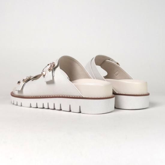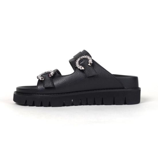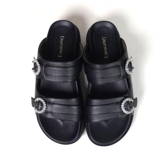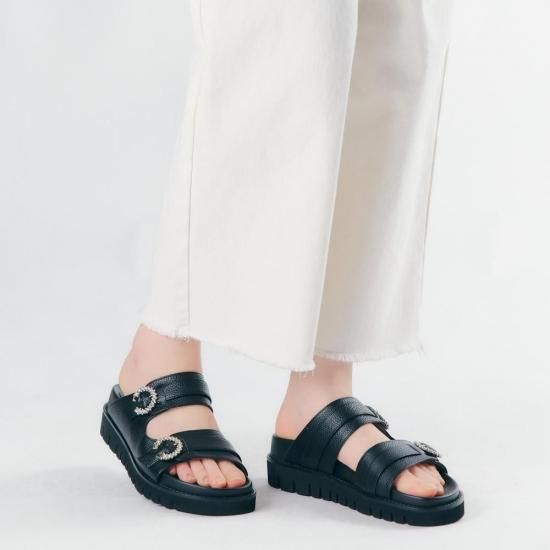 アッパーにあしらったビジューバックルと、品のあるしなやかなレザーが、カジュアルなフットベットサンダルを大人仕様に格上げ。