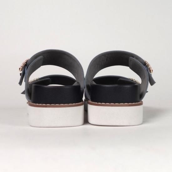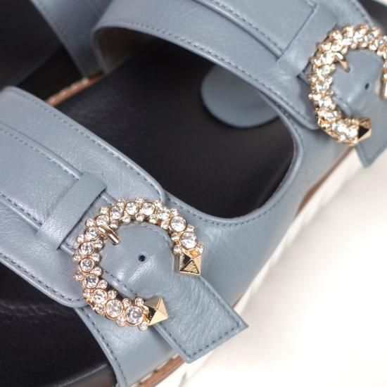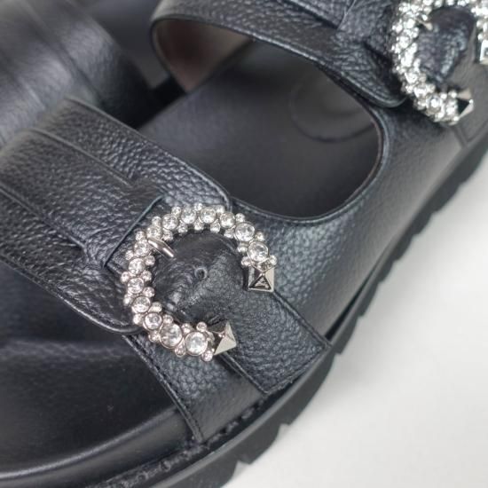 エレガントなビジューバックルがポイントの厚底サンダル。