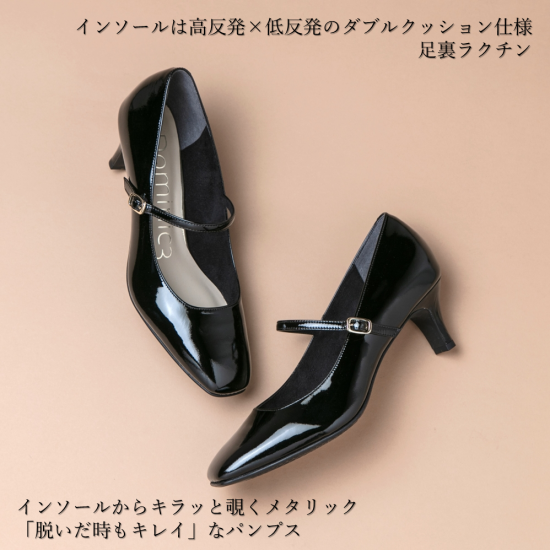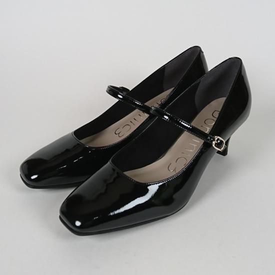 甲のストラップ使いで抜け感のあるデザイン。足のおさまりの良いスクエアトゥで脚をキレイに見せつつ、包み込んでくれる履き心地。