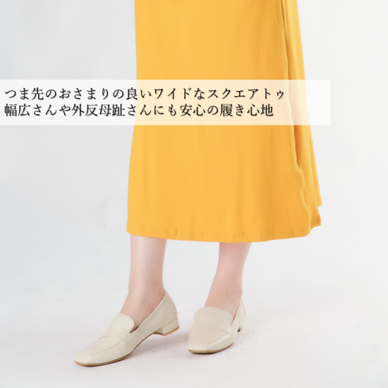 つま先のおさまりの良いスクエアトゥで幅広さんや外反母趾さんにも安心の履き心地。