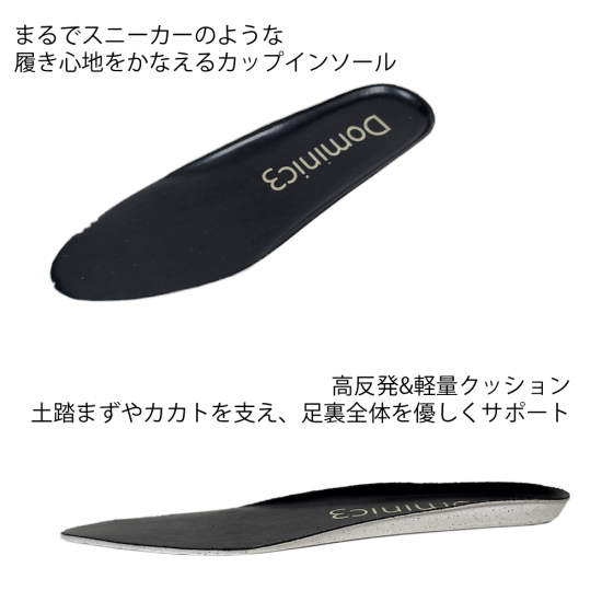 インソールにスニーカーと同様のカップインソールを使用し、土踏まずやカカトを支え、足裏全体を優しくサポートします。