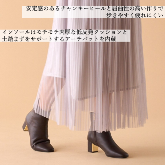 安定感のあるチャンキーヒールと屈曲性の高い作りで、歩きやすい設計。